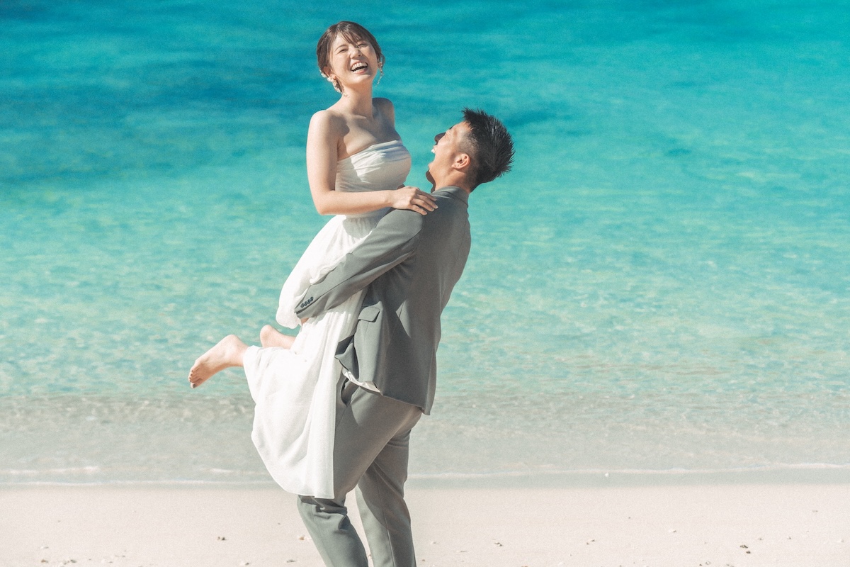 沖縄の海を満喫できる!ドレスを着たまま海に入って撮影ができる南国ならではの人気オプションです。(20カット)