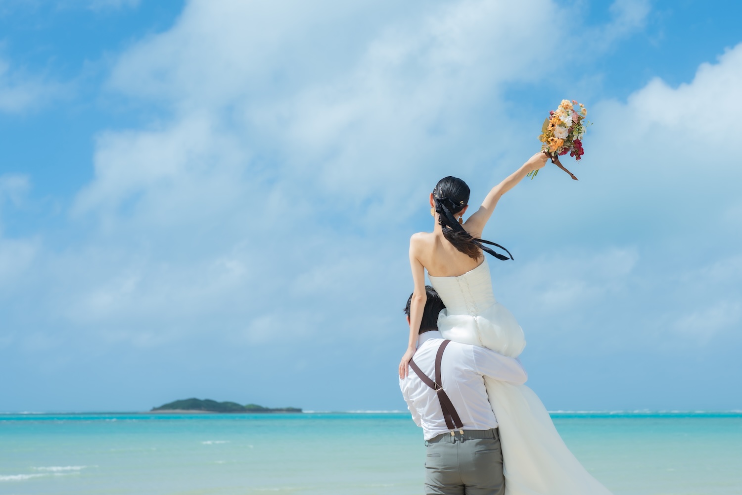 沖縄の海を満喫できる!ドレスを着たまま海に入って撮影ができる南国ならではの人気オプションです。(20カット)